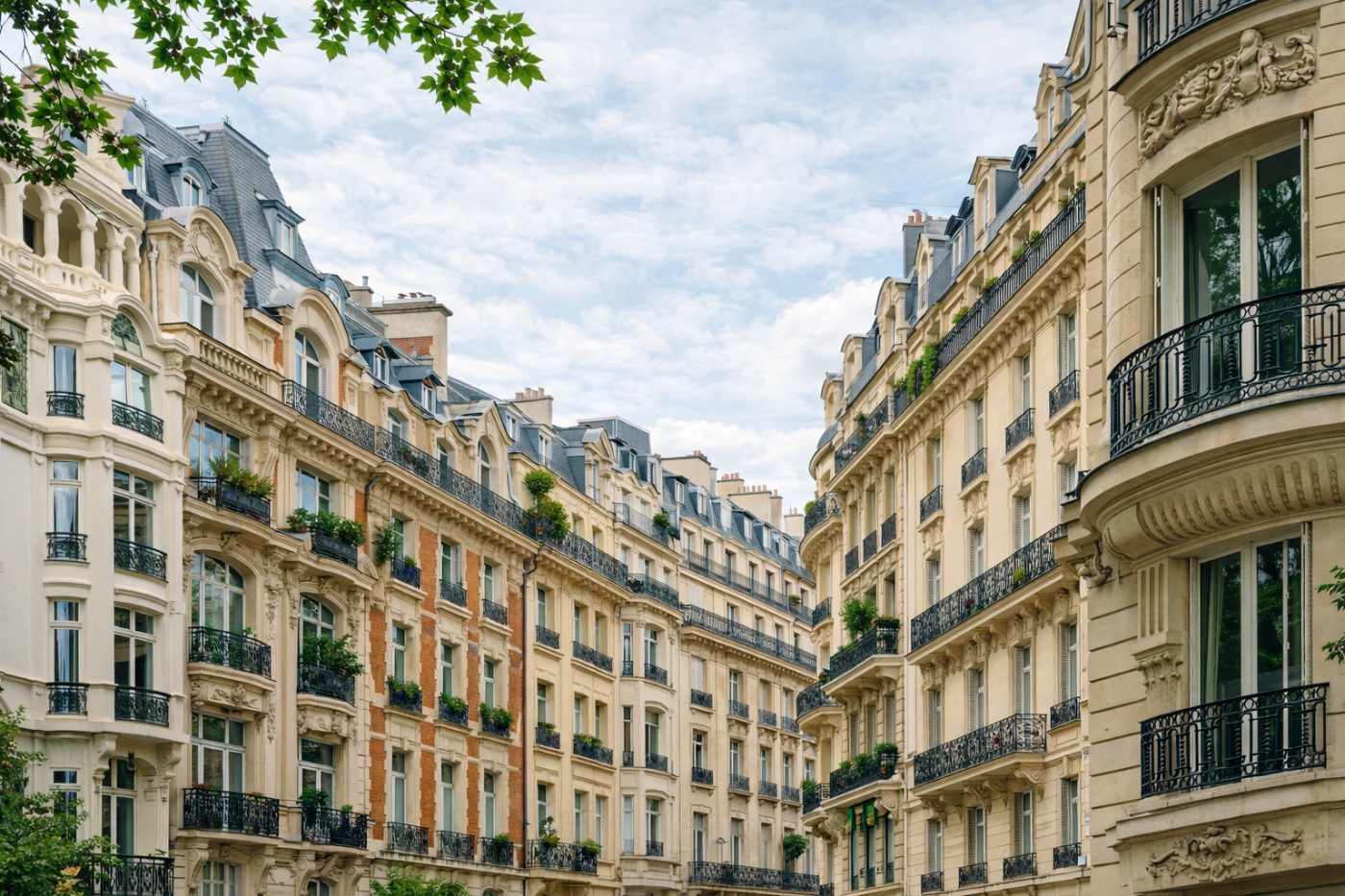 // 1 grande carte dark avec photo haussmannienne en fond.